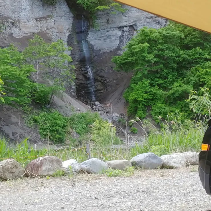 目の前に荒川と滝があります。