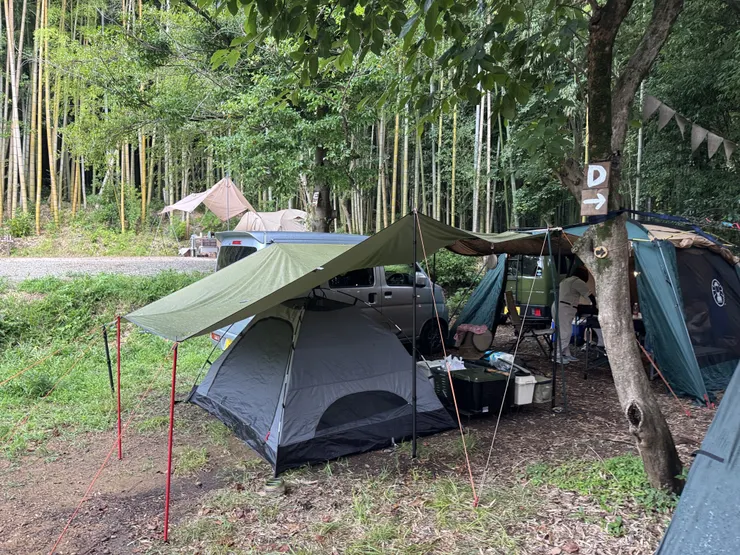 静かな森の中でのキャンプ場は設営後に雨が降り地面がぬかるんで大変でしたが雨が止んだ後は仲間と楽しい時間を過ごすことが出来ました♪