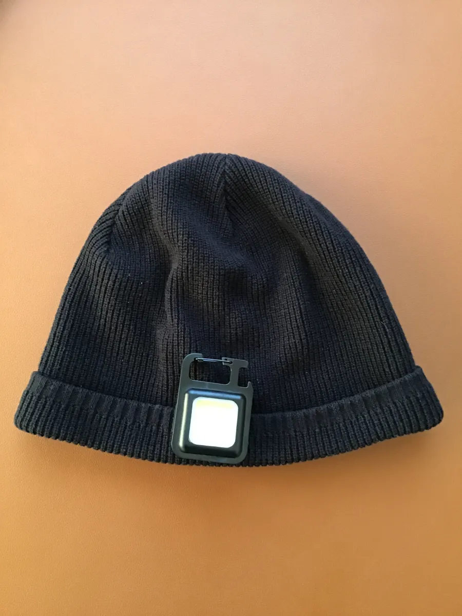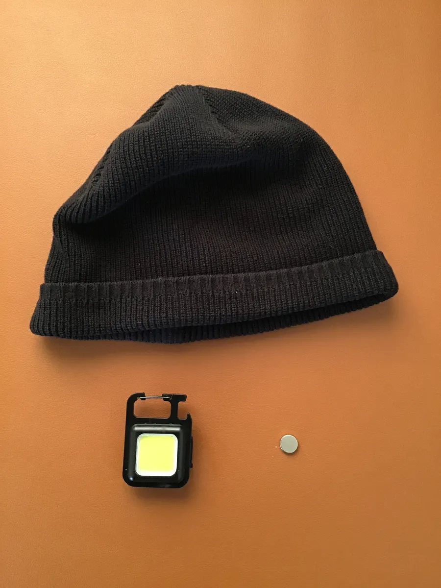 ニット帽、ローカルの100匀でサービスデーに税込で300円購入したCOBライト、ネオジム磁石(ダイソー4個入りで110円