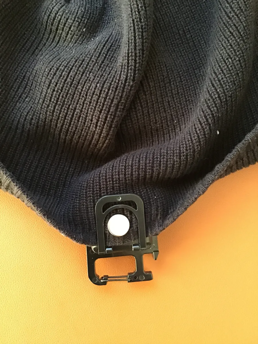 COBライトのクリップ部分で、ニット帽の折り返しを挟んでネオジム磁石で止める
