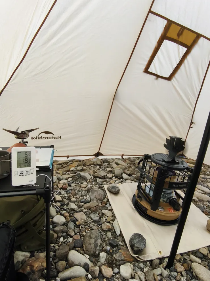16時前、テントの外の気温はすでに5.4℃まで低下しましたが、K3-GM1+ストーブファンで幕内は19℃程度に落ち着きました。