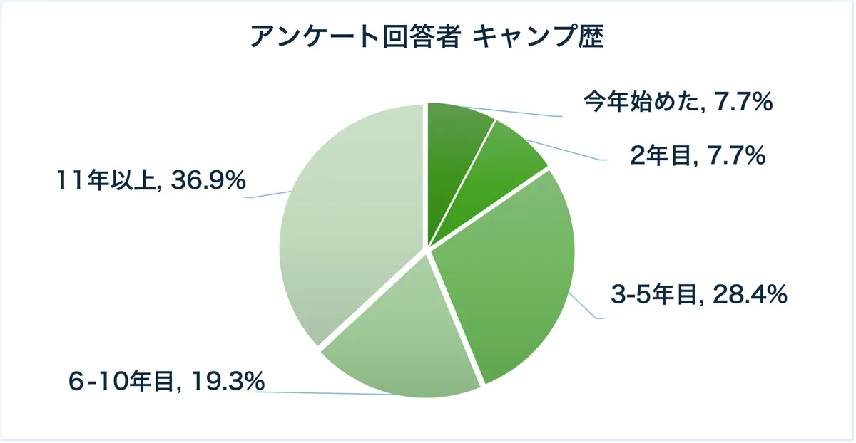 今回のアンケート回答者の内訳を見てみると、確かに歴11年以上のベテラン層(36.9%)が最多ですが、キャンプが本格的な趣味になり始めた「歴3〜5年」の方も28.4%、さらに「歴1〜2年」のビギナー層も約15% と、全体の過半数が幅広い層で構成されています 。