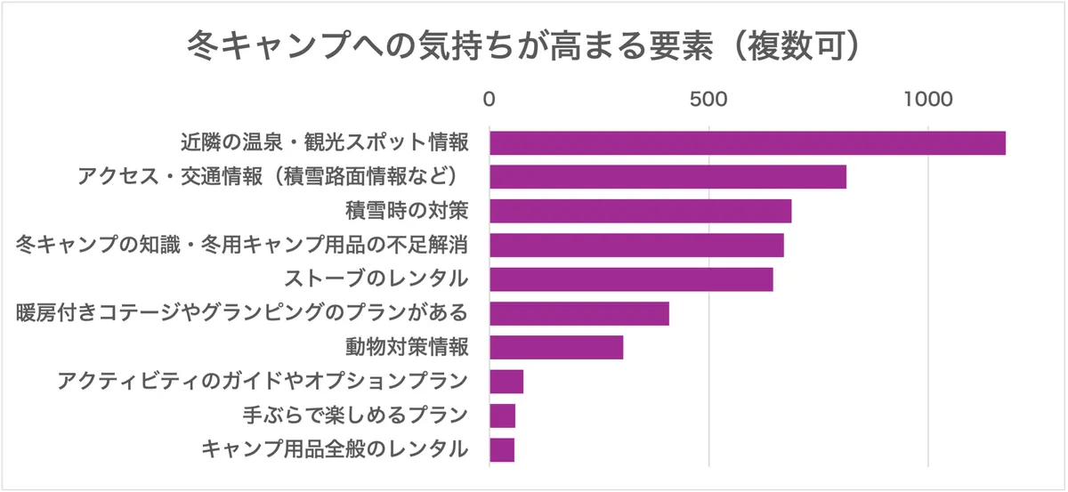 注目したいのが「冬キャンプの知識・冬用キャンプ用品の不足解消」というニーズが上位(4位)に入っていること 。 「冷え込み対策は?」「どんなアイテムを選んだらいいの?」といった、知識や装備面での不安を解消できる情報があれば、もっと多くの人が冬キャンプに挑戦できることがわかります 。