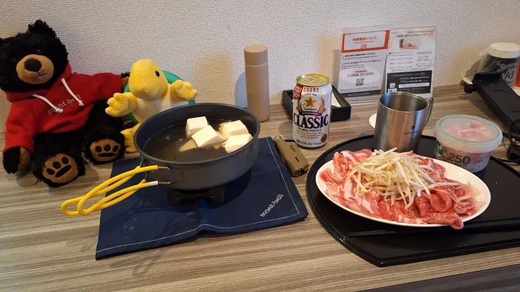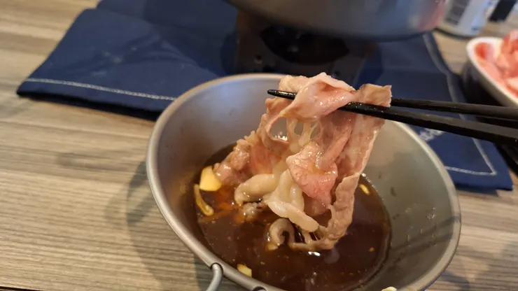 ③④ お高いお肉でしゃぶしゃぶ。gemini(AI)と相談して、鍋用のポーションに、水を既定量の2倍(300mL)入れました。お手軽にしゃぶしゃぶを楽しめました。100g=1480円の牛肉はとろけたぁ。