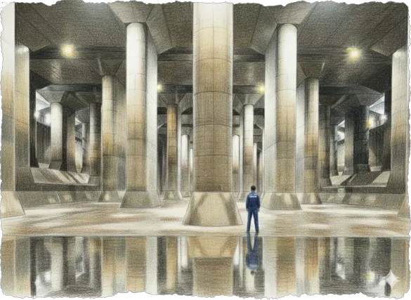 ![]() キャンプ場から車で約29分 地下にある高さ 18 m の柱と調圧水槽天井を見学できる首都圏外郭放水路のミュージアム。 |