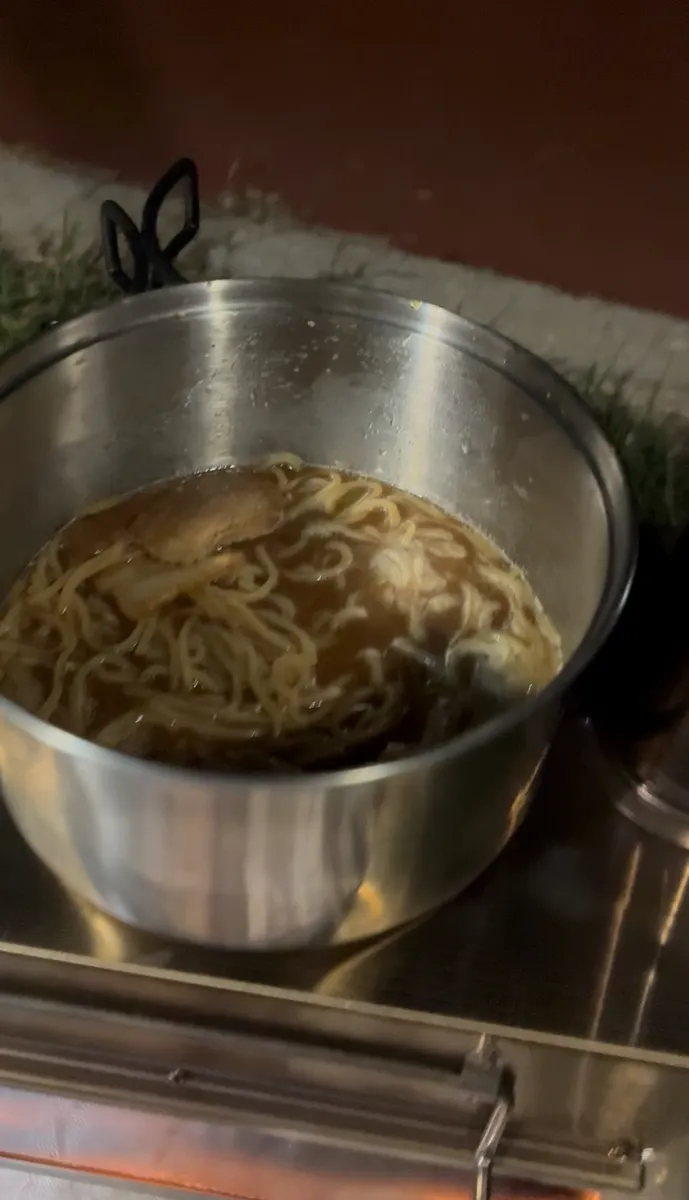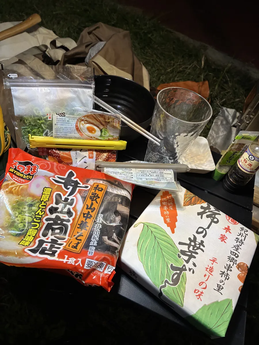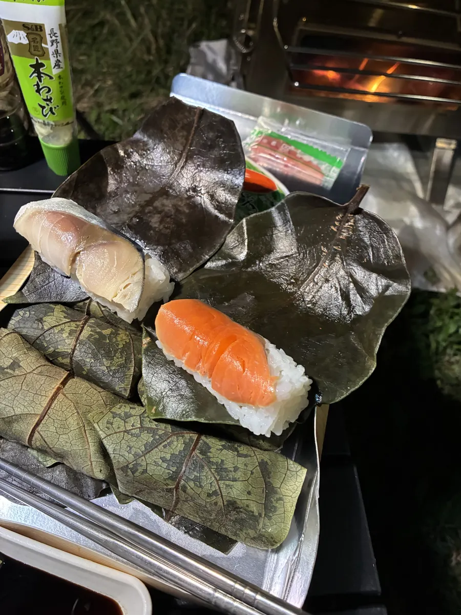 今回は薪ストーブ出す予定だったから冷凍ラーメンを鍋で溶かすだけと火が要らなくて地元、紀ノ川の何か食べたかったので柿の葉寿司