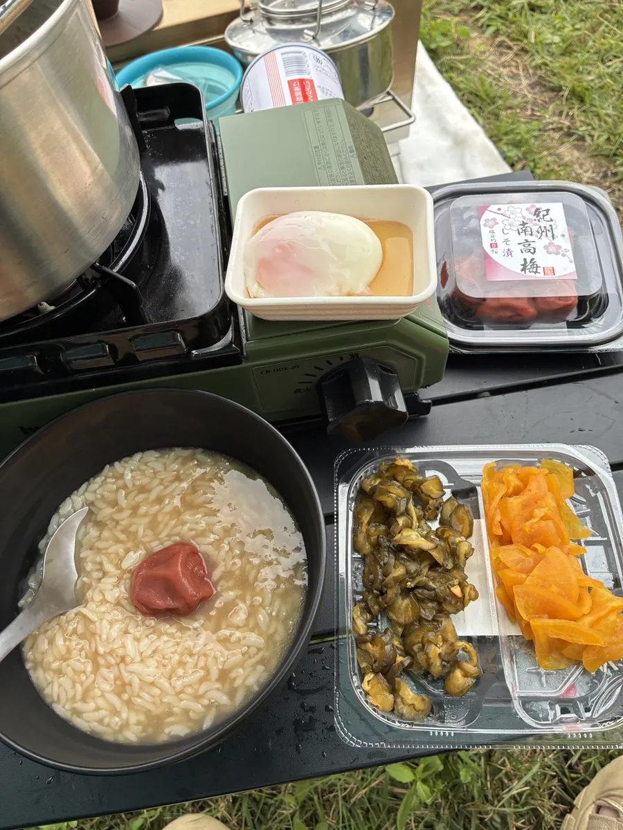 朝ごはんはサラッとサトウのご飯で「茶粥」この辺ではおかいさんて言って、生米からお茶で炊いていただくらしい