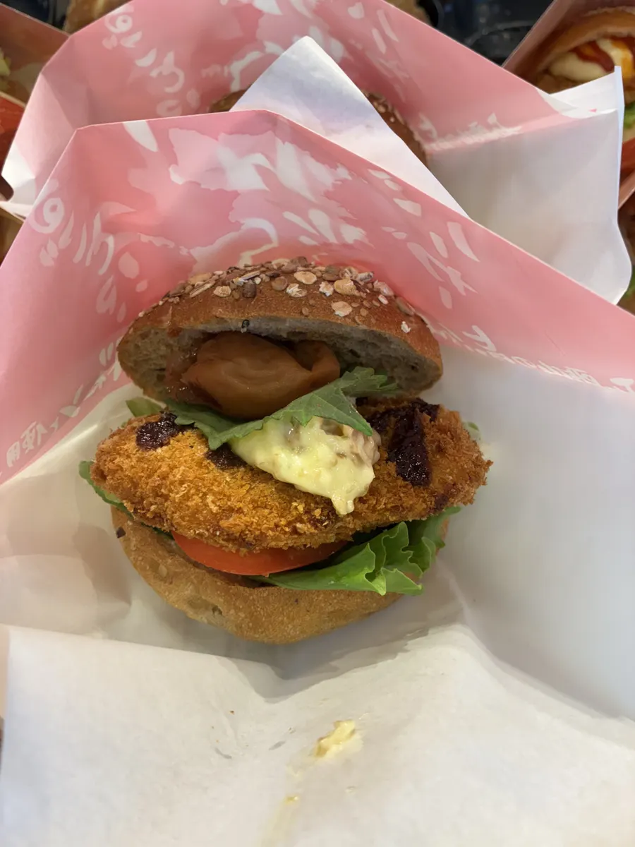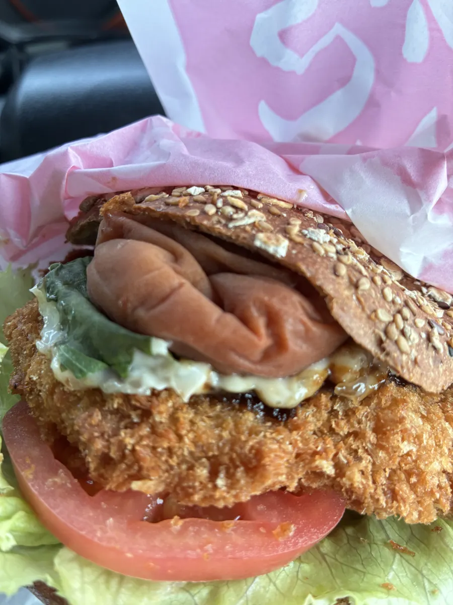 まるっと完熟梅とタルタル、大葉、トマトがチキンカツに最高にマッチしてて甘酸っぱくて美味しい!