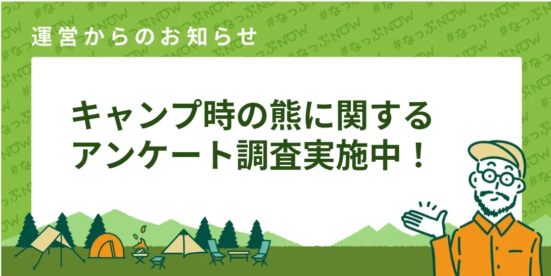 そこで、キャンプを楽しむ皆さまがどの程度「熊」を意識され、どんな対策をしているのかを知るため、意識調査アンケートを行っていますので、ぜひご協力をいただけますと幸いです。
