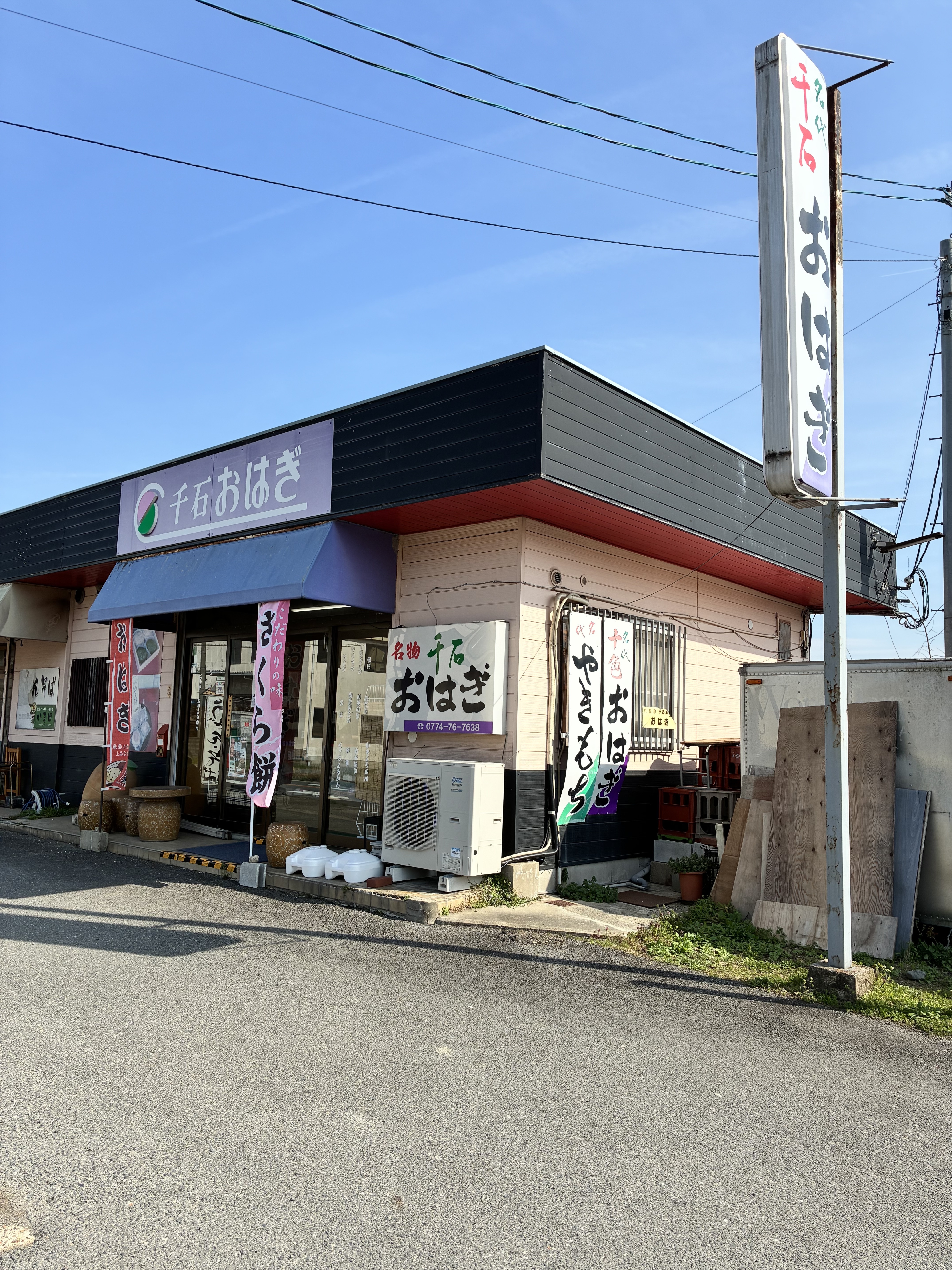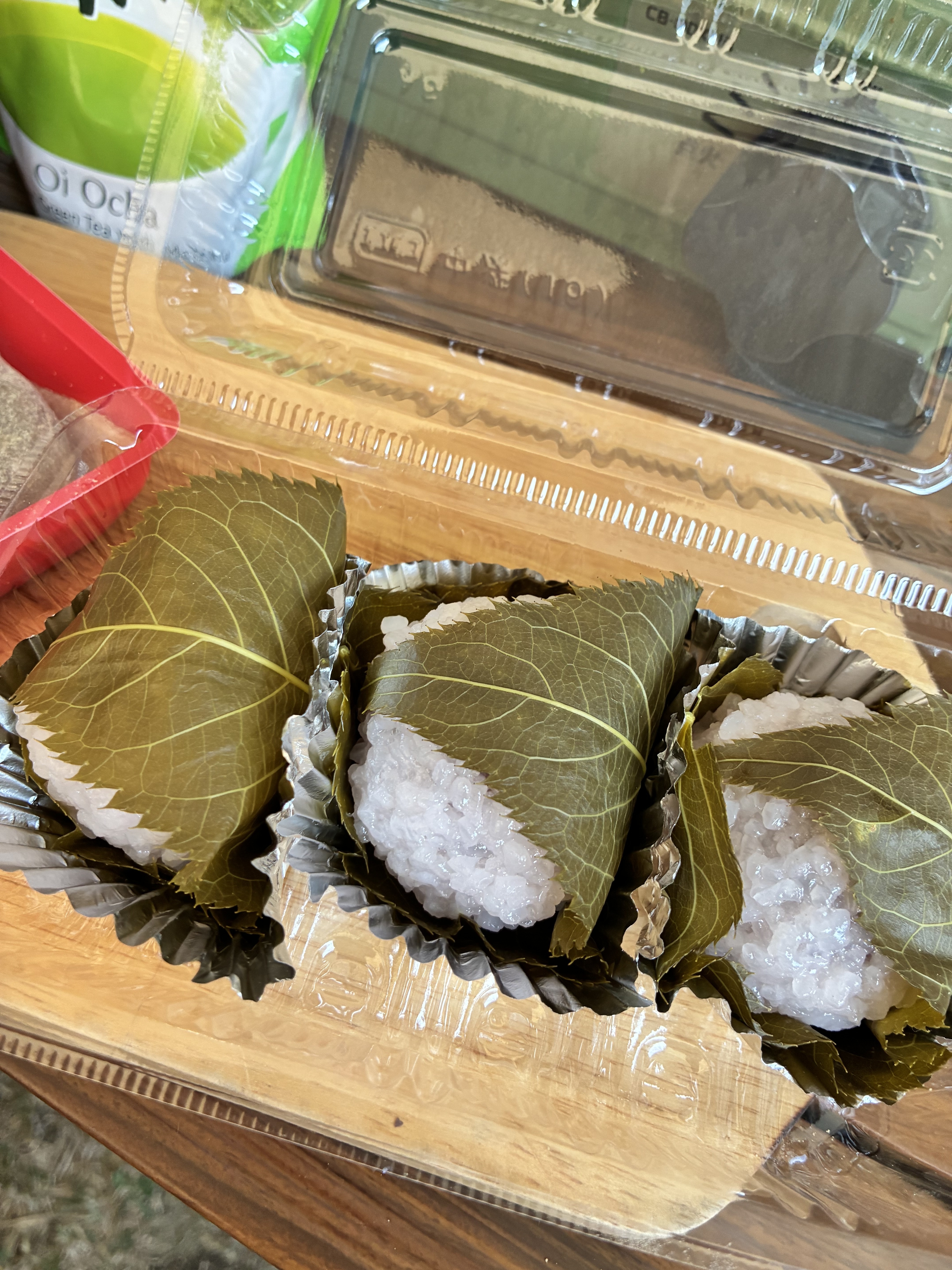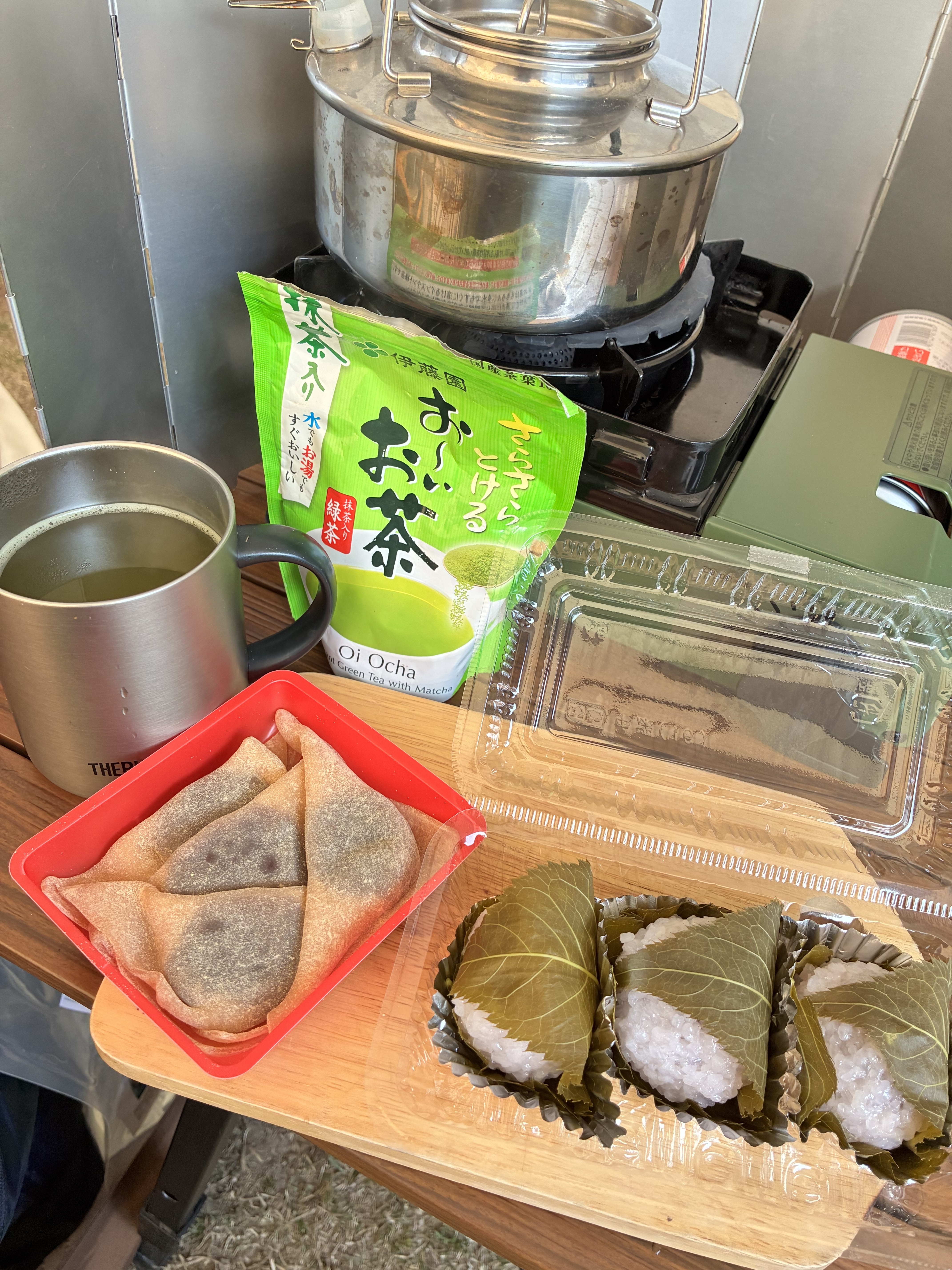 設営後のおやつはキャンプ場近くのおはぎ屋さんの桜餅、あとスーパーのお土産屋で買った生八ツ橋