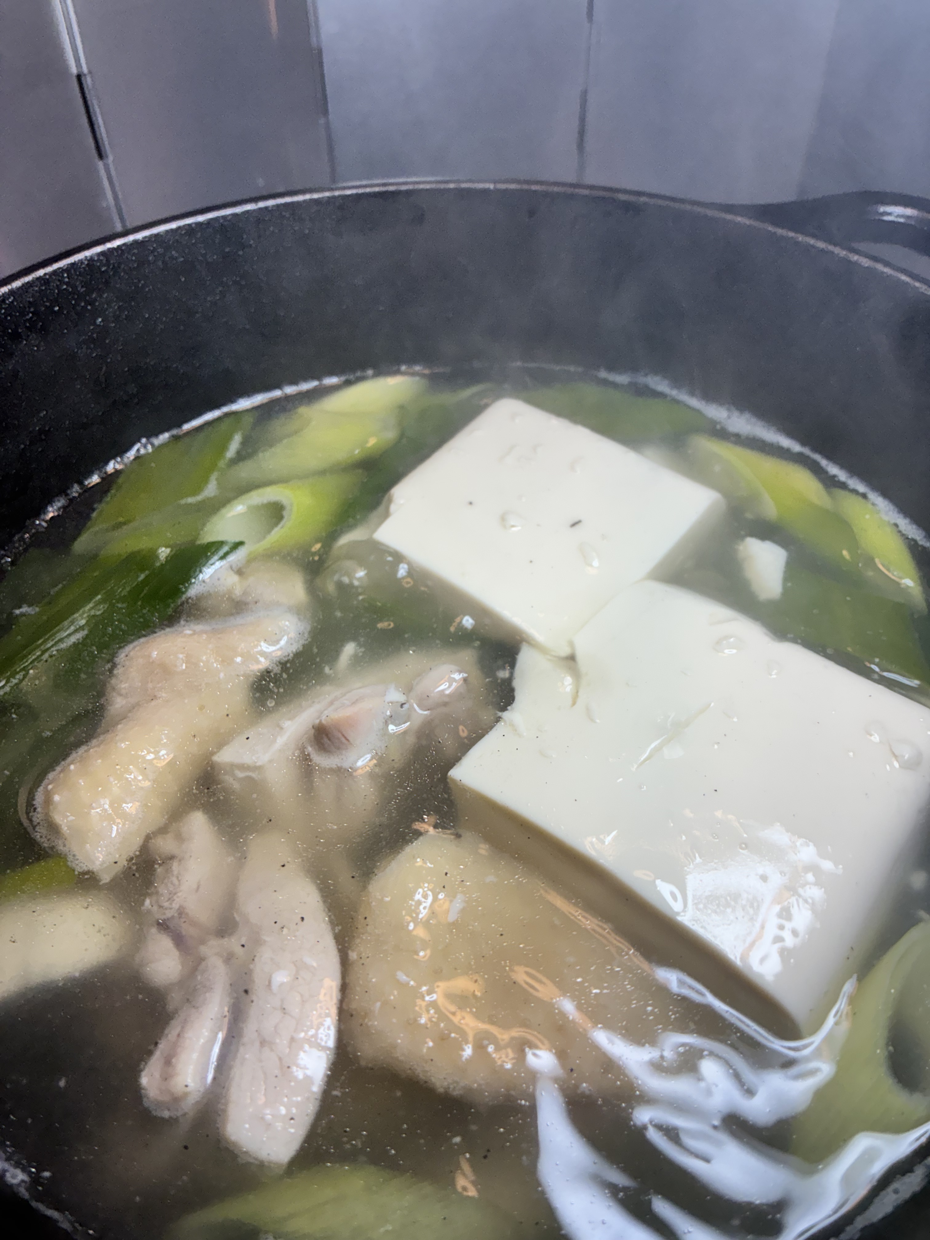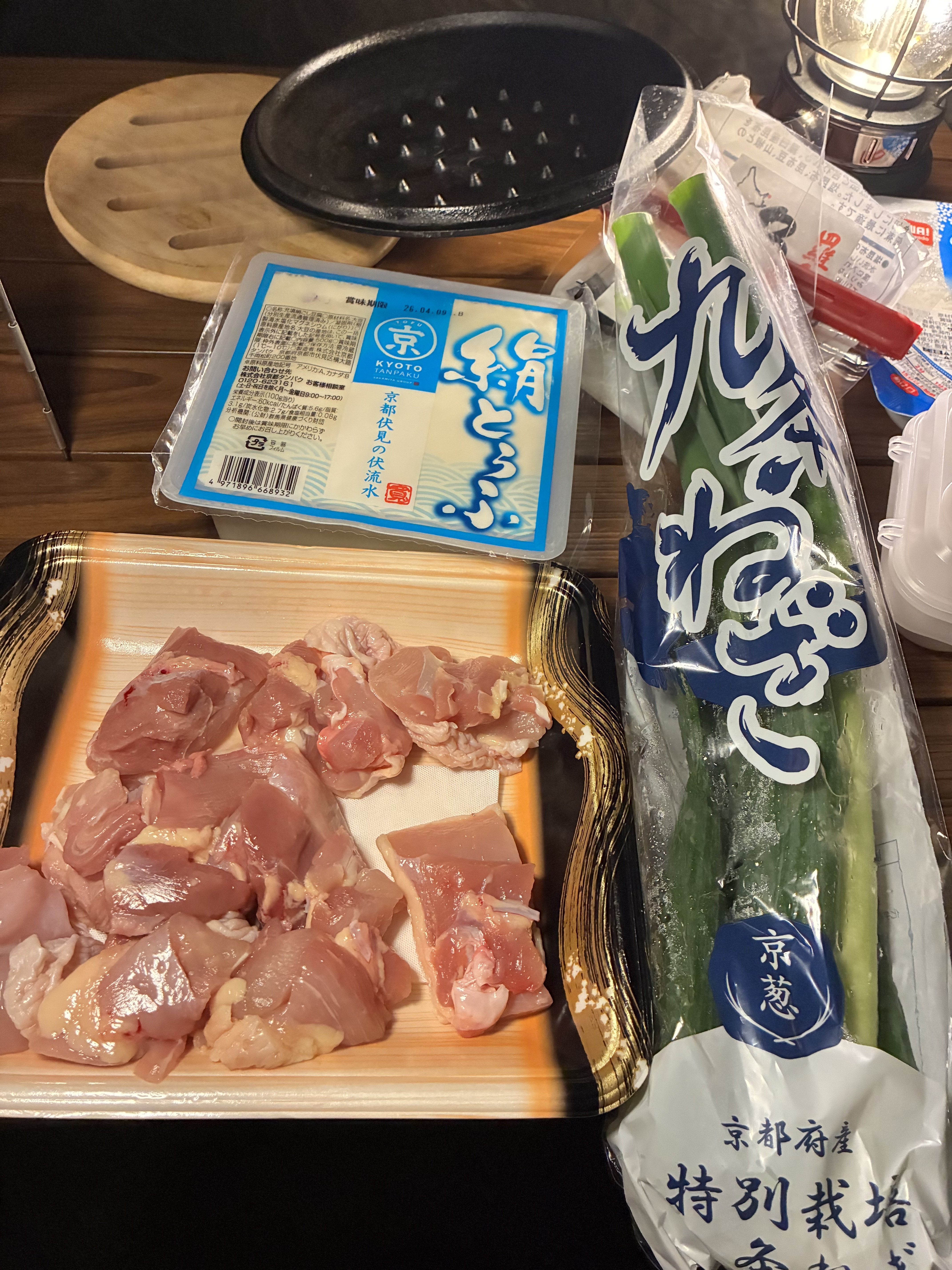 晩御飯は京都の地のもの九条ネギ、京豆腐、京地どり赤鶏で湯豆腐