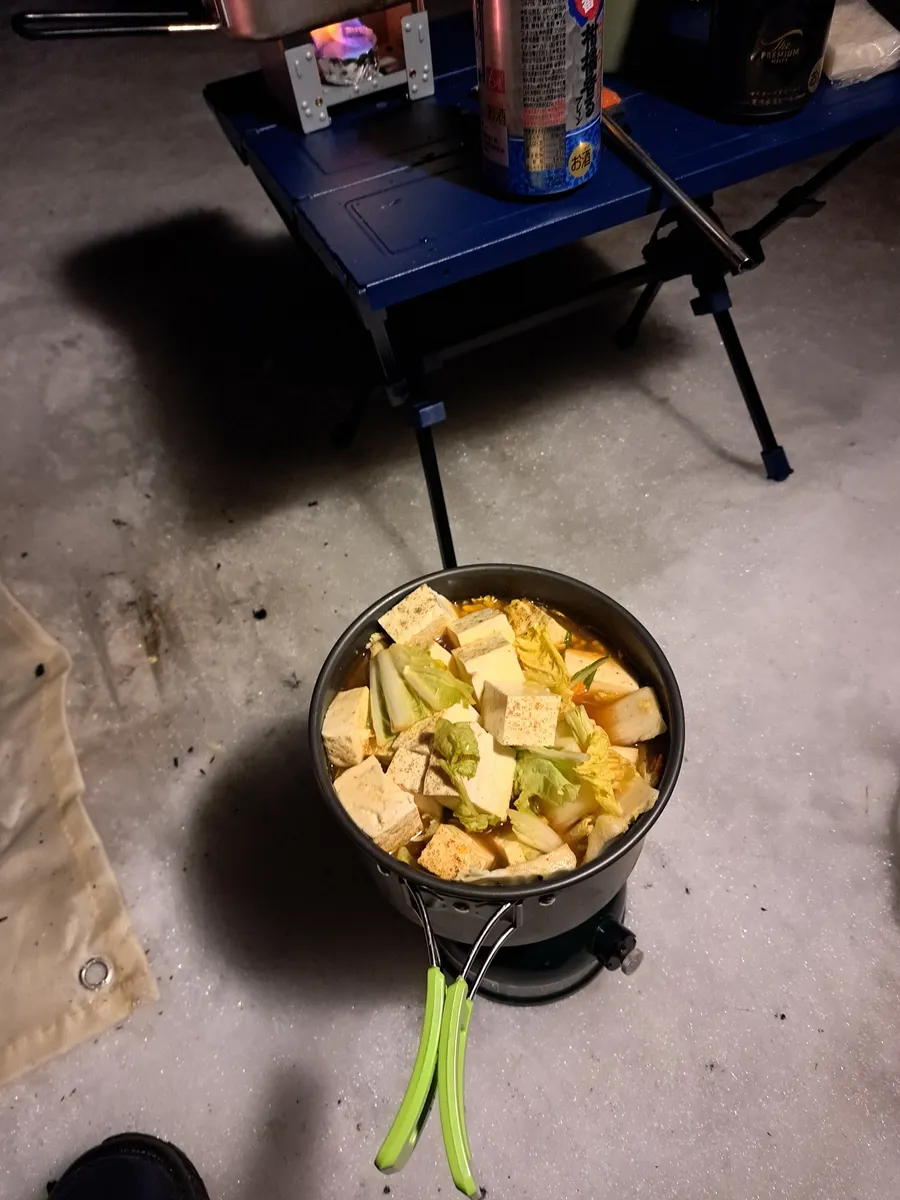 並行して夕食の準備も始めます。今日はキムチ鍋。ご飯は1合炊きのダイソーメスティンで、しっかり1時間くらい水に浸してから火にかけましたが、米は芯が残るどころか、生煮え状態で大失敗💦寒い中での炊飯なので上のほうまで熱が回らなかったんでしょう。