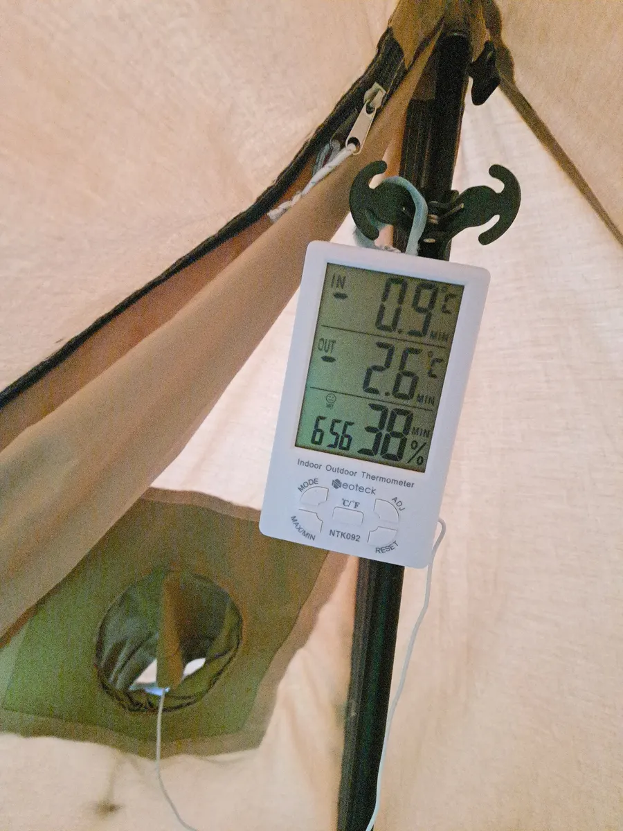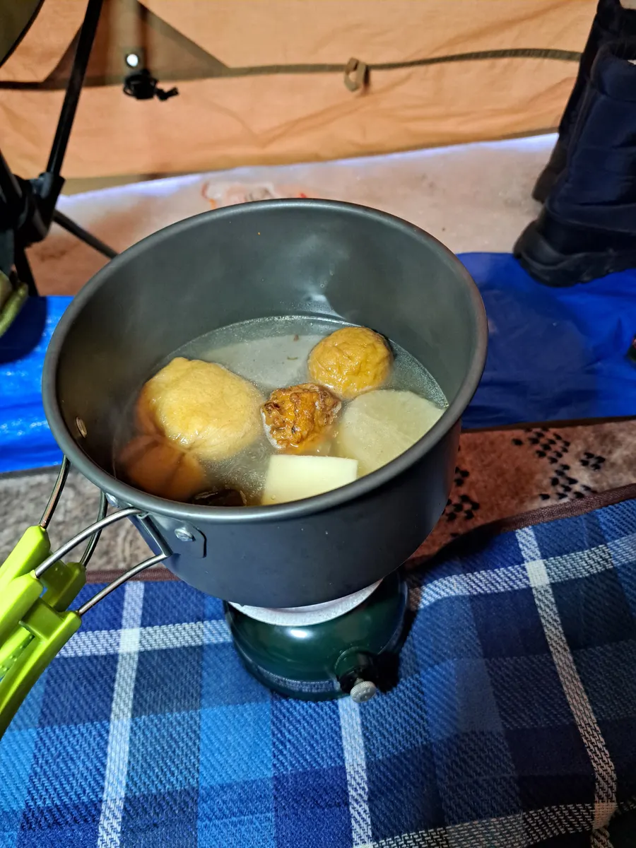 夜は-2.6℃までしか下がらず思ったより冷えませんでした。とはいえ寒いことには変わらないので朝食は暖房を効かせたテント内でおでんをいただきます。