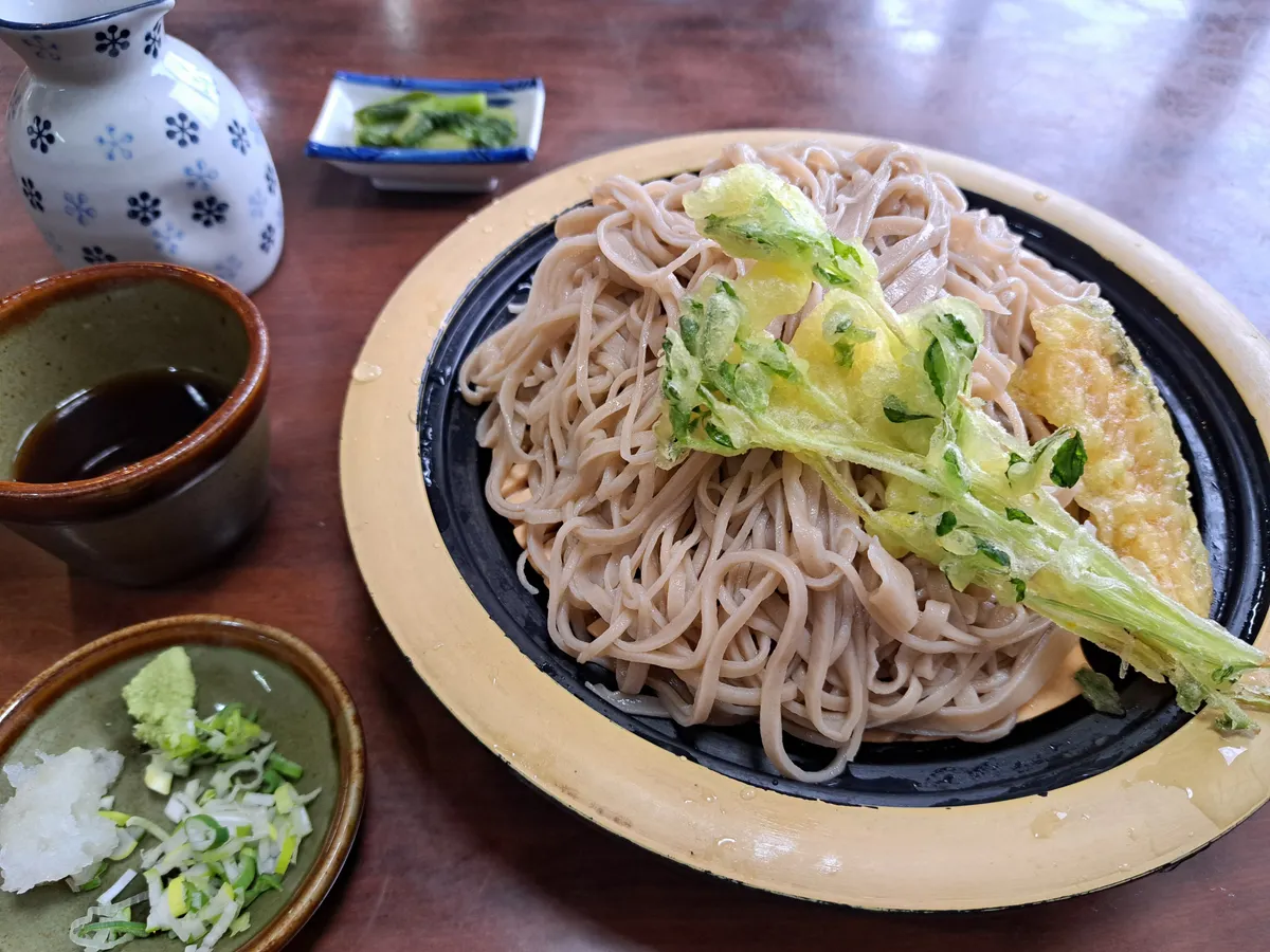 さらに、田舎の県道沿いにぽつんとある手打ちそばの店でざる蕎麦をいただきます。