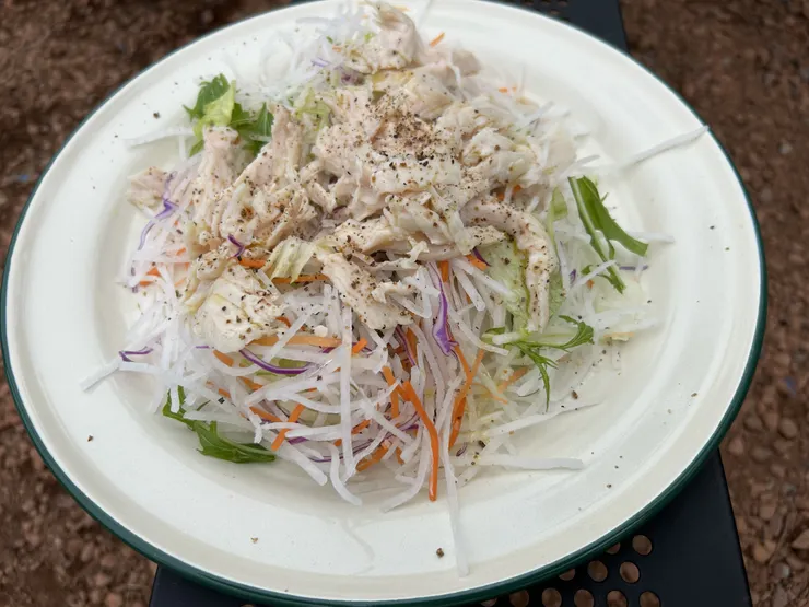GW最初のキャンプのキャンプ飯は麻婆豆腐のシェラカップ丼と大根サラダ