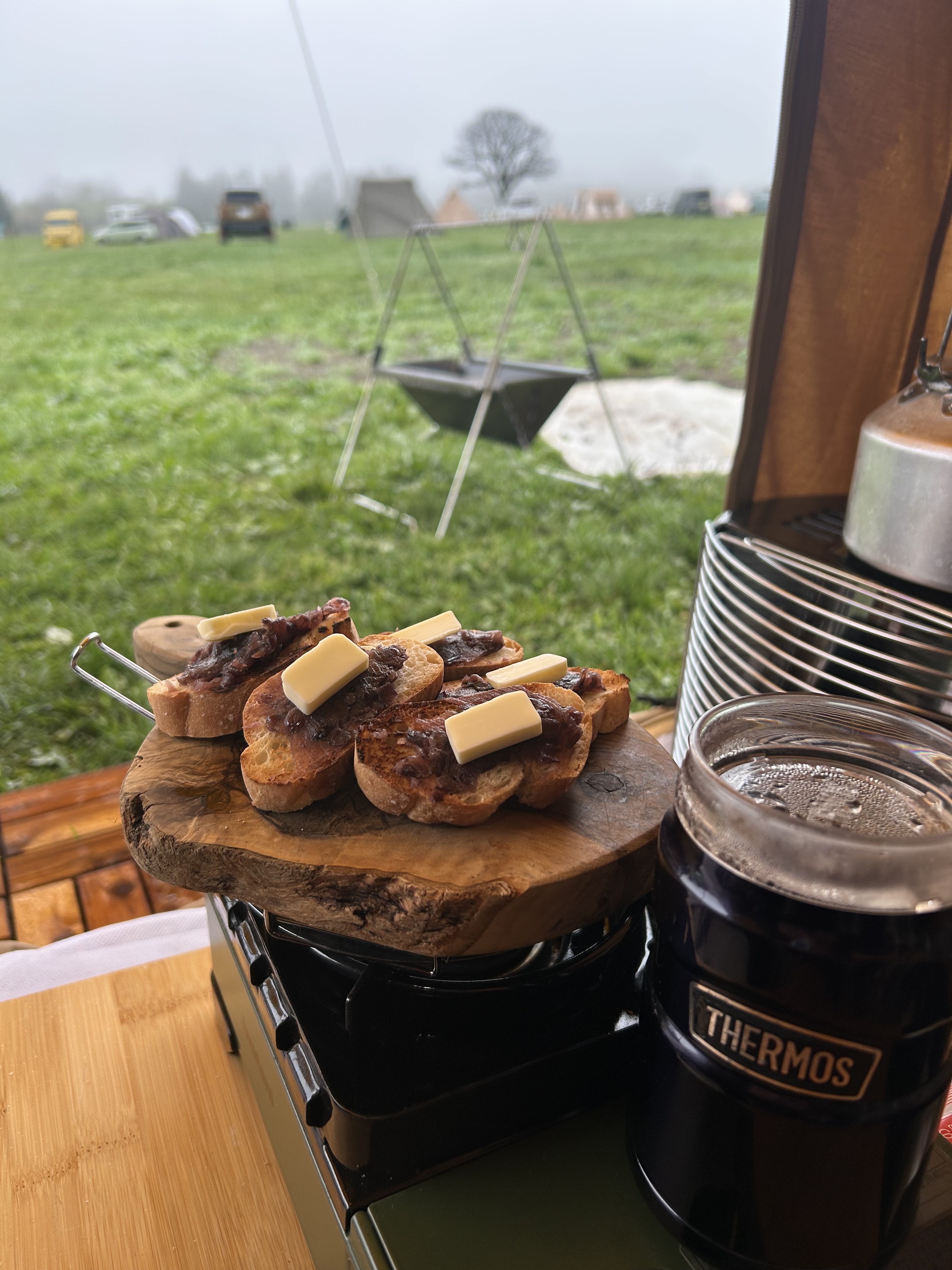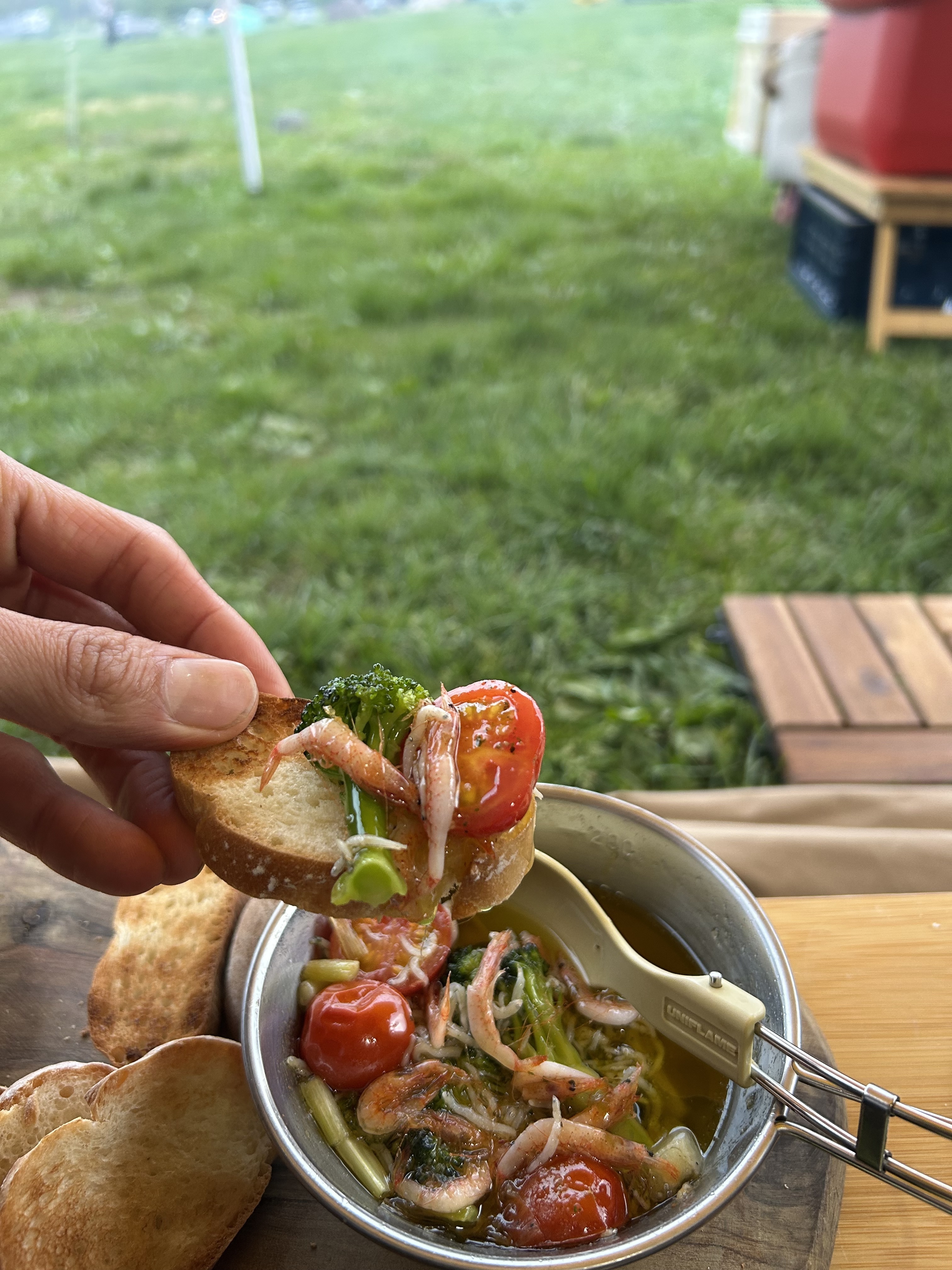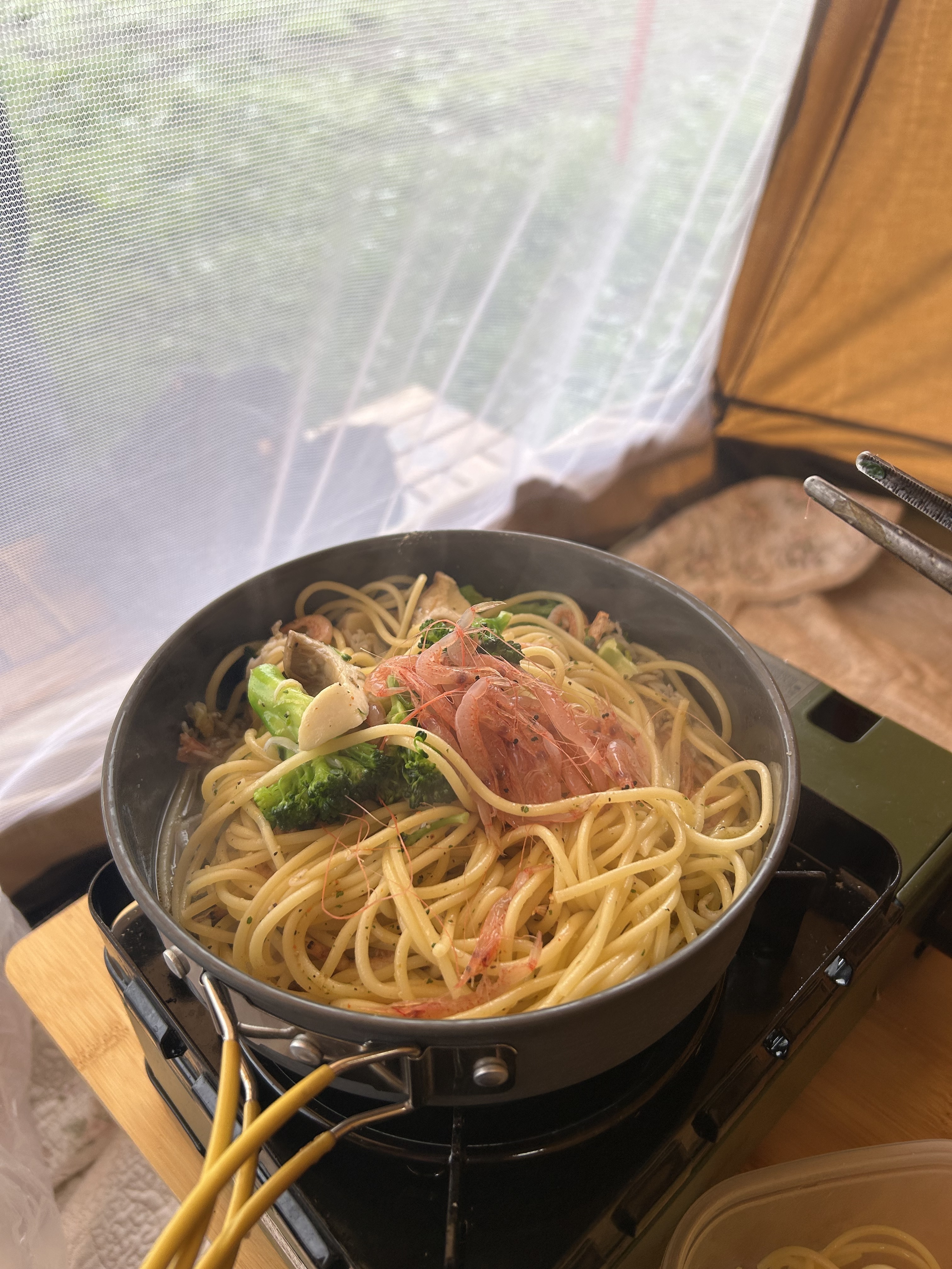 とりあえず、朝食にあんバータートーストを作って少しづつ片付けながら、テントでのんびり過ごし昼食に昨晩の残ったアヒージョで桜エビのペペロンチーノを作り撤収作業してたら最後の最後に✨