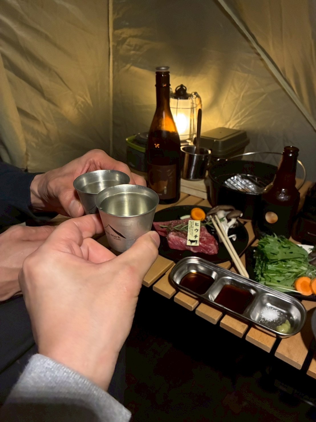 日が暮れてからは、一緒に来ている先輩のテントで一杯飲んで🍻