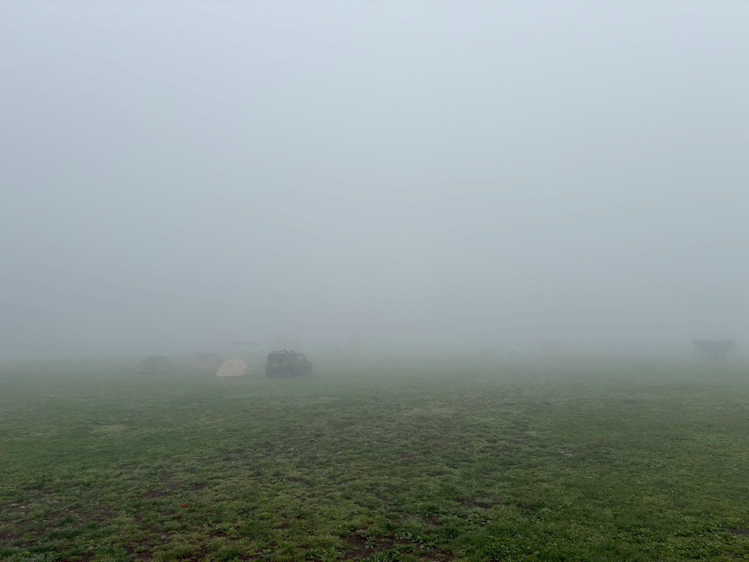 夜は小雨が降り続き朝方は止みましたがさすが、朝霧高原の名が示す通りホワイトアウト状態で前が見えない💦