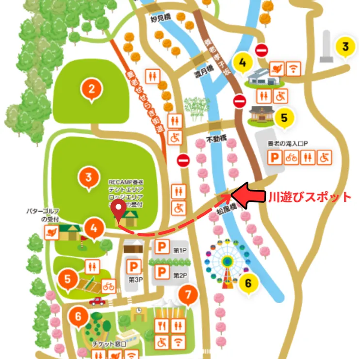RECAMP養老の管理棟から5分ほど歩くと、日本の滝百選にも選定されている「養老の滝」から流れている小川で川遊びができます!