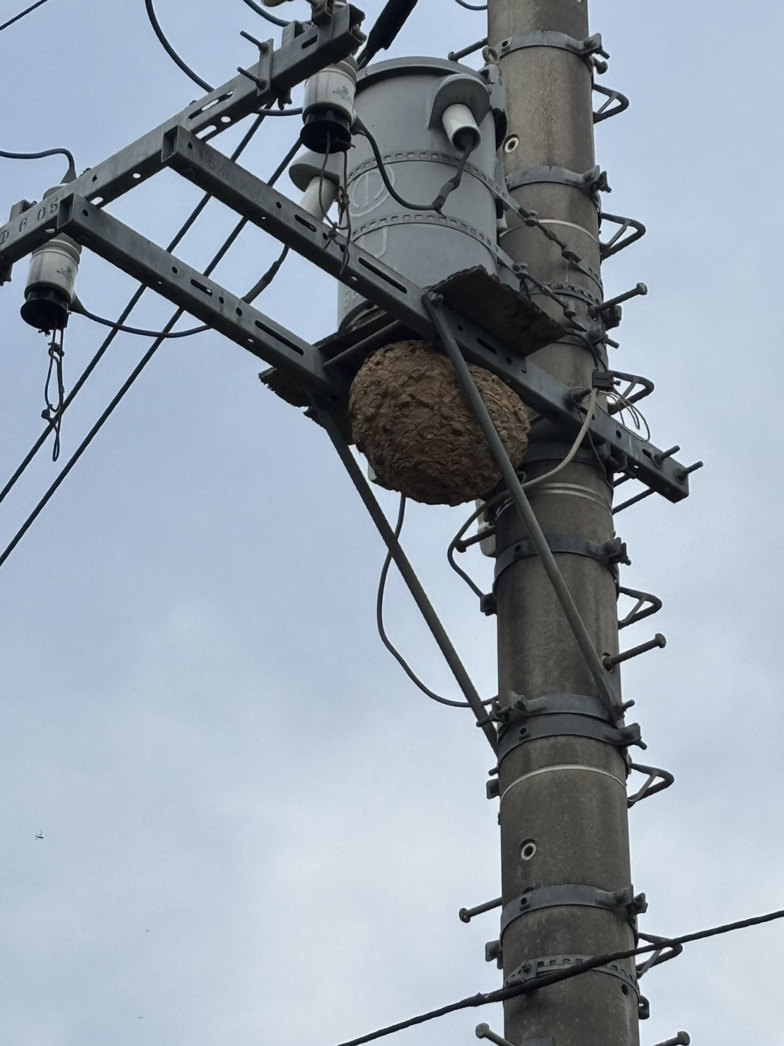 キャンプ場内に数匹のスズメバチが飛び回り、宿泊の皆様が刺されないよう巣を探しましたが見つからず、範囲を広げて探していると、なんと約1kmも離れた電柱にスズメバチの巣があることを発見しました。