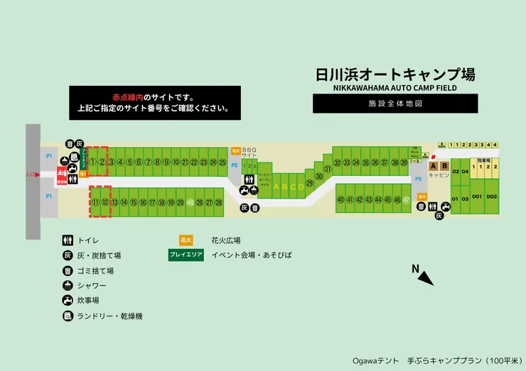 こちらのプランの1,2,11,12番サイトは、管理棟から一番近い場所に位置しており、海にもすぐに行くことができます。