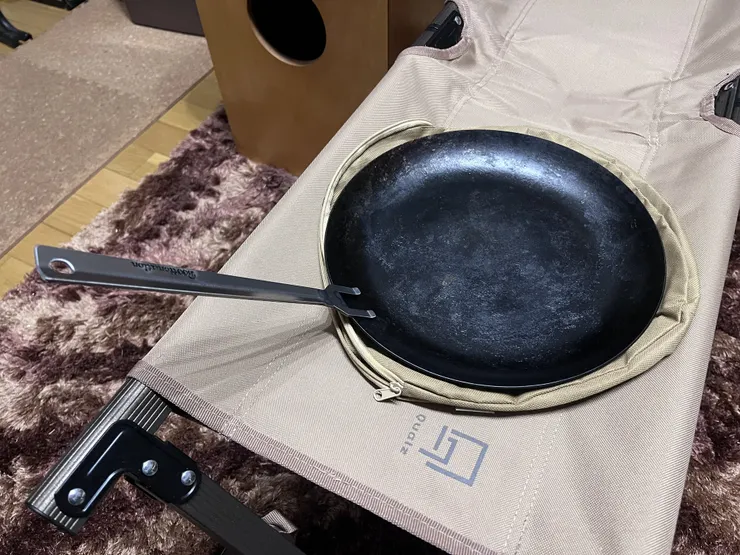 薄くて、セリアにもちょうどいいフライパンカバーが売ってるので、キャンプだけでなくウイークリーマンションに滞在する時などもお供で連れて行きます。というかまさに今がそうなのですけど。