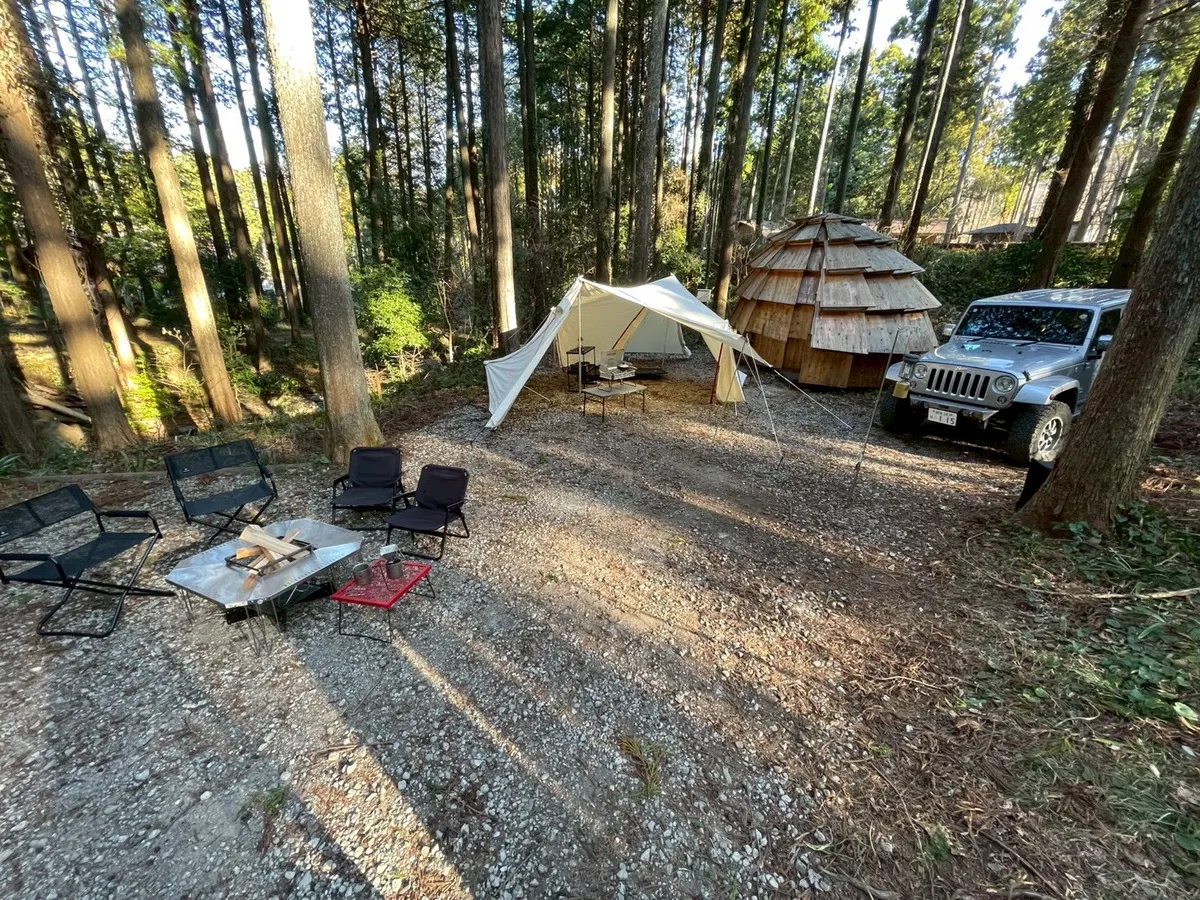 日中: 広いサイトにテントとタープを張り、外でBBQや焚き火を満喫。