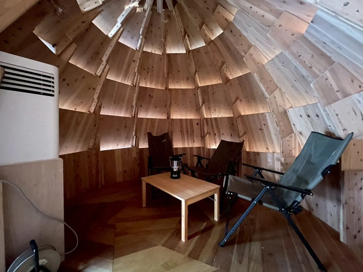 休憩・団らん: CAMPPOD内はエアコン完備。