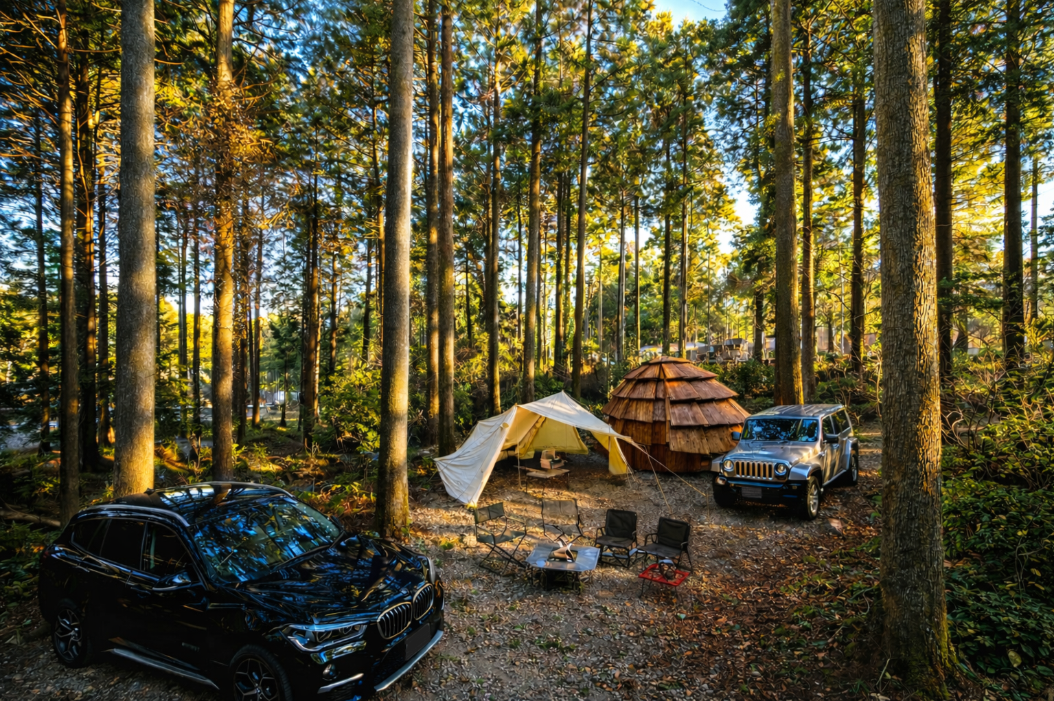 ここは、「本格的なテント泊」を楽しみながら、「エアコン完備の快適なリビング」を併用できる、ハイブリッドな特等席です。