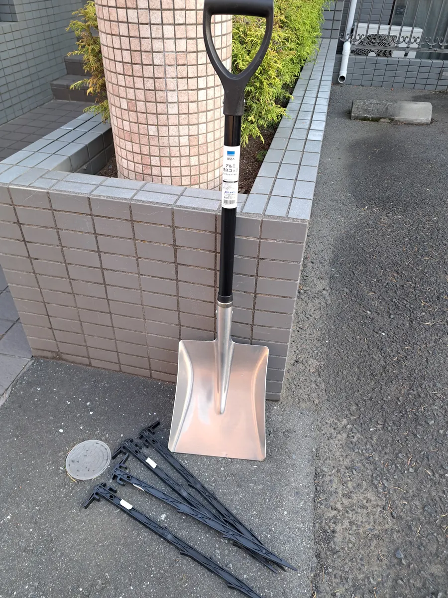 積雪地でのキャンプは通常のペグが効きにくいそうで、返しのついた農業用のプラスチック杭が便利ということを聞いていたのでホームセンターではこの杭とスコップを購入しました。