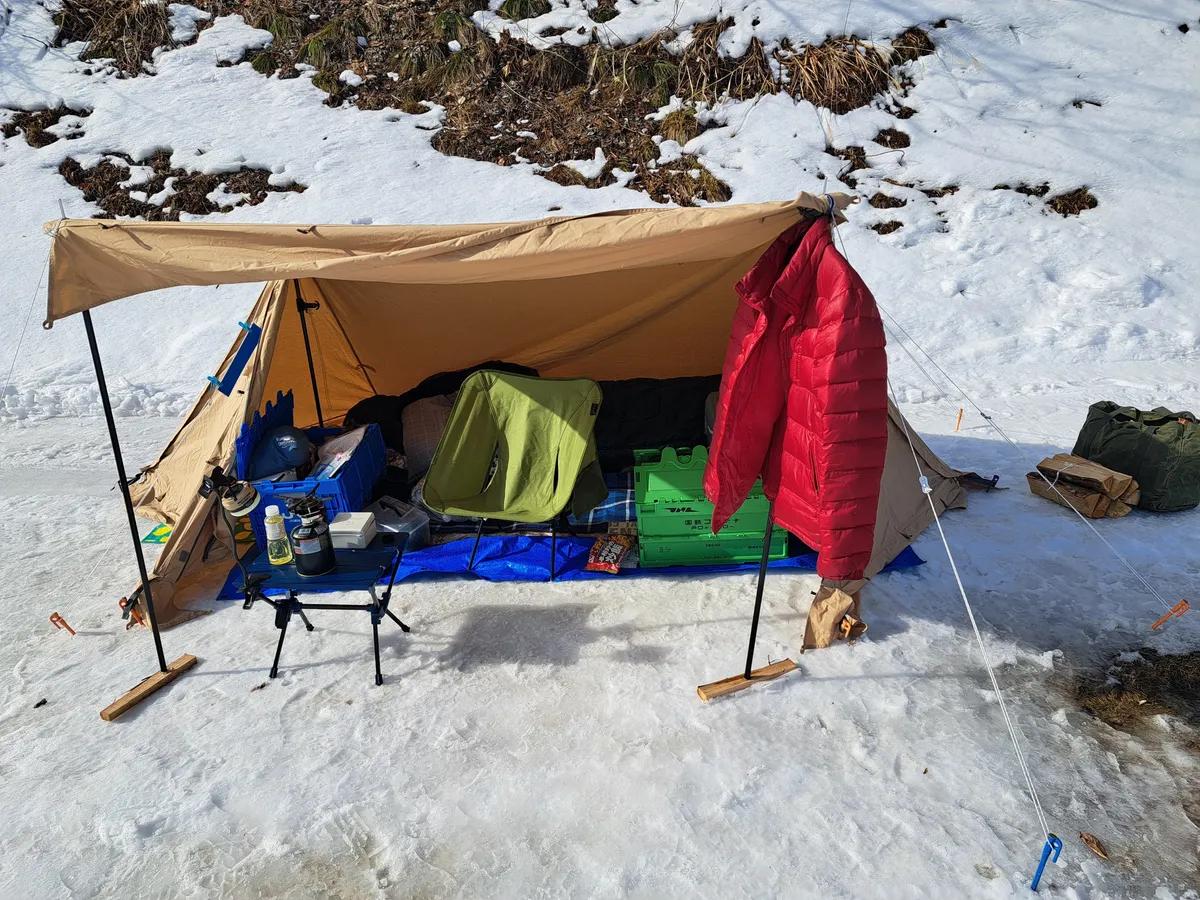 雪中と言うよりは雪上キャンプと言った感じで、今回はスコップもプラ杭も出番はなさそうです。