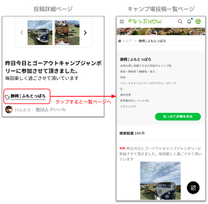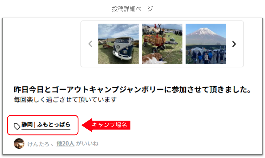 投稿の際に「キャンプ場を設定する」でキャンプ場名を指定して投稿すると、投稿の下部にキャンプ場名のリンクが表示されます。