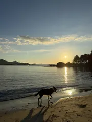 初めてのワンコ連れキャンプ サンセットビーチ フリーサイトを利用しました⛺️ワンコOKだったので目の前のビーチで思いっきり遊ばせました🐕コンビニもら近くにあり🏪トイレ🚽バス🚿もきれいでした✨サウナも気になります👍また利用させていただきたいと思いました⛺️