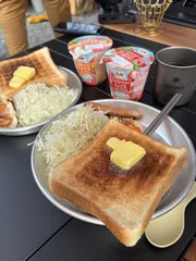 朝ごはん。いつもはマルチグリドルでパンを焼いてたけど、久しぶりにユニフレームのマルチロースターでトーストを。キレいに焼けました😊ただ、コーヒー完成との時間差で食べる時にはちょっと冷めてた😓