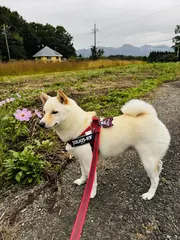 花より団子な女シーバ 10月上旬のキャンプでの1枚です住んでいる場所ではまだまだ暑く汗だくになっていたけれど那須高原での朝は8℃と寒かった~😆コスモスが咲き出していて写真を撮ってみたけれどお花には興味無い愛犬でした😂