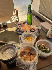 設営後の一杯😊今日はお天気よく、ビールが美味しい〜〜道中、たまーに雪が残ってたり。キャンプ場にも雪が残ってたり。来たばかりなのに、次のキャンプを考える