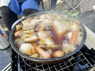 スンドゥブキムチ鍋🥰 どうしてもキャンプで鍋を作ってみたかったのです❣️❣️ 今回は家の残りのキムチに粉末出汁をたっぷりと💖具材はつみれと豆腐に韓国海苔とネギ😘デイキャンプなのでもちろんノンアルと🥃外で食べるととっても美味しく感じますね🍲✨✨ 締めはテント内で、チョコレ