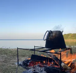 海辺で早朝の焚火