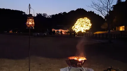焚き火とオイルランタンとイルミネーション 焚き火とオイルランタンとキャンプ場のシンボルツリーに飾られたイルミネーションのコラボレーション🔥✨️