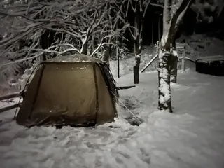 雪中キャンプ予報で雪が降る事は分かっていたけどこんなに降り積もるとは思わなかった。電気毛布とカセットガスストーブで快適に過ごせ良い思い出となりました。amazonのセールで買った新品テントがベチャベチャに、、、。