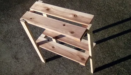 今回は、キャンプサイトで手の届く範囲に調理器具や色んな物を置けて非常に便利なラックを木製でDIY しました🔨 ↓材料(一部加工済み)の全体です👍 構造は2段構造として、各々の棚の上下間隔と地上からの高さを設定して組立てました。また、キャンプ場の不整地の多さをクリアするために脚は3