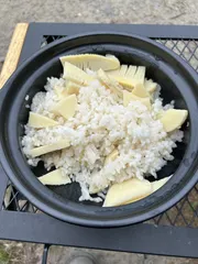 筍ご飯 キャンプと言えばご飯。旬の筍を使って春グルメを堪能しました。自然を感じながら旬を楽しむ!!外ご飯サイコーです👍
