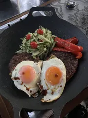 まぁライズったら😅朝食の買い物すっかり忘れて朝からハンバーグを作ることに😅キャンプ中の食事🍽️です!
