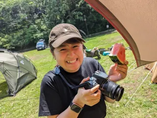 笑顔満開!スイカとカメラで夏満喫 この写真は、会社で新しく立ち上げたキャンプ部の初キャンプで撮影してもらった、私がスイカを手にした瞬間を切り取ったものです。この笑顔の理由は、みんなよりも一つ多くスイカをもらった喜びがあふれ出ているからです。自然の中でみんなと食べるスイカは格別でした!!