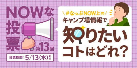 第13回NOWな投票がスタート!今回はいつもと少しテイストを変えて、今後のイベント企画などの参考にさせてもらう投票テーマとさせていただきます。テーマは「#なっぷNOW上のキャンプ場情報で知りたいコトはどれ?」です。今後、みなさまにより楽しんでいただける企画をお届けするためにも、ご協力いただけると嬉し
