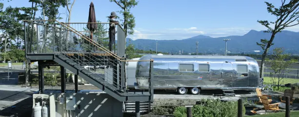 RECAMP富士スピードウェイ 『ヴィンテージトレーラーコテージ』のご紹介 名物コーナーの100Rの内側からコースを望む唯一無二の場所に設置された近未来型のトレーラーハウスにて、サーキットの興奮と静寂をご体験ください。アメリカから輸入した1970年製のエアストリーム「sovereign」の