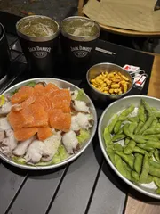 いつも食べ過ぎちゃうので今日は設営後の一杯は抜き🥲早めにお風呂に入って、早めの夕食タイム😊ブイヤベース鍋ができる間に、豪快海鮮カルパッチョと枝豆、激辛ピーナッツでカンパーイ🍺