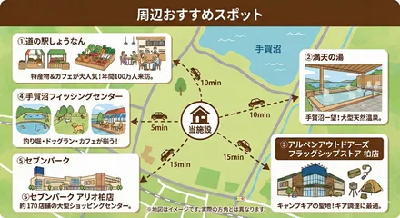 周辺15分圏内で、アクティビティや温泉も充実。ショップも近くてとっても便利!<スーパー・ショップ>・道の駅しょうなん(車で10分)沢山の特産物&カフェが立ち並ぶ、年間100万人以上が立ち寄る人気スポット!・セブンパーク アリオ柏店(車で15分)千葉県柏市に誕生した約170の専門店「アリオモール」