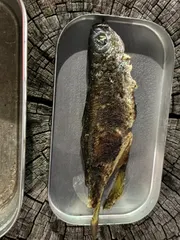 やはりタカベは釣ったら塩振って焼いて食べるのが一番だ今月は焚き火台を使わない前提でガスバーナしかないからBBQシートで焼くしかない時期が夏なら脂いっぱいでアジとかより遥かにめちゃくちゃ美味いんだけど、今はまだ普通に美味い程度の魚でしかない夏が待ち遠しい