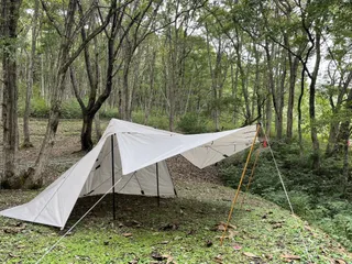 こちらが新幕のテンマク ブラックサミッド まぁ初張りでピン張り出来ずシュン😞ライズが手抜きした事もあってこんなんになってしまったのだけど😅 テンマクのララちゃんをインナーに❣️可愛い🩷ララちゃん ライズには丁度いい大きさ‼️オールシーズン行けますね。ポール調整でスカート
